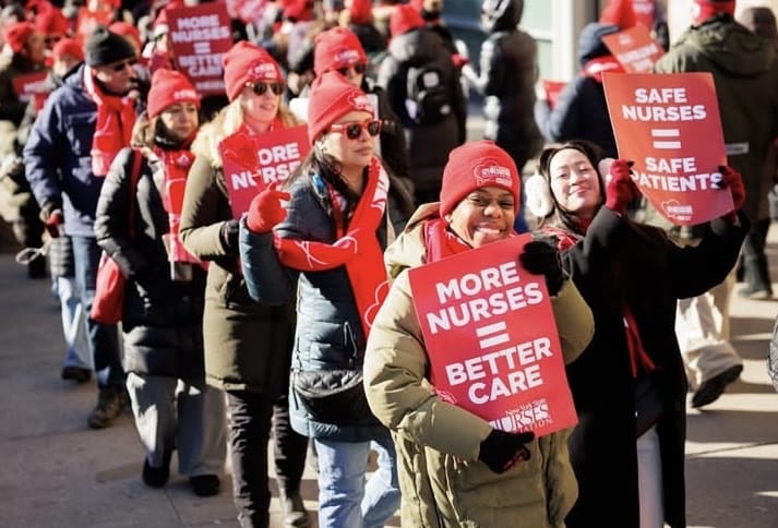 De acordo com o New York State Nurses Association (NYSNA – Sindicato de Enfermeiras do Estado de Nova Iorque) desde o dia 22 de dezembro de 2025, 97% dos profissionais de enfermagem do setor privado filiados ao sindicato votaram a favor da greve, que se iniciou no dia 12 de janeiro de 2026.