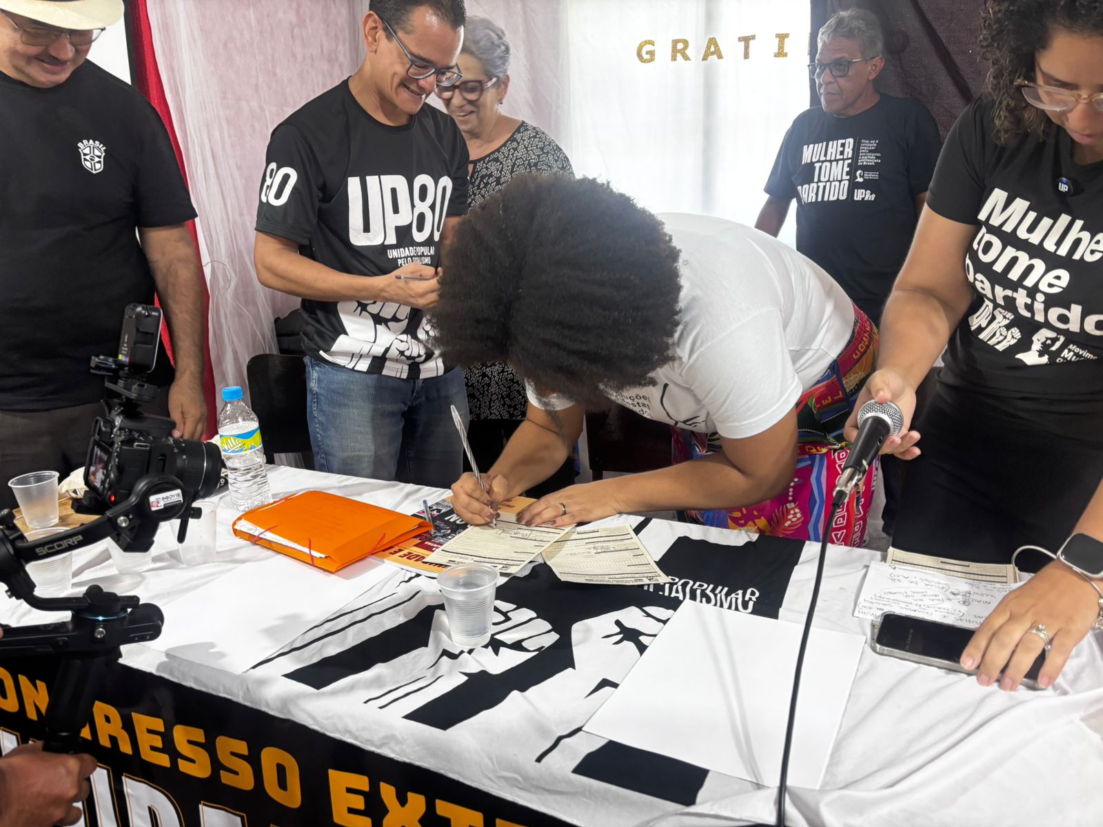 Samara Martins assina ficha de filiação de militantes históricos dos movimentos sociais durante a abertura do congresso estadual extraordinário da UP em Pernambuco. Foto: Vitória Pereira (JAV/PE).